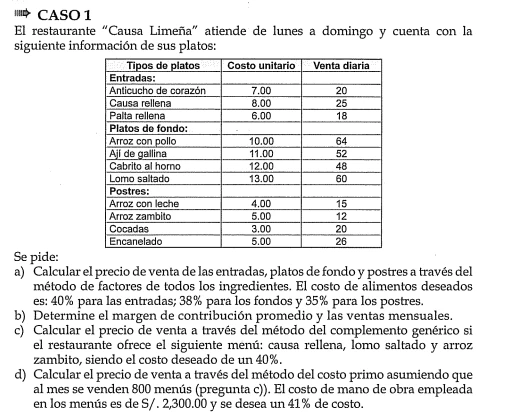 determinar el precio de venta para cada uno de los platos.