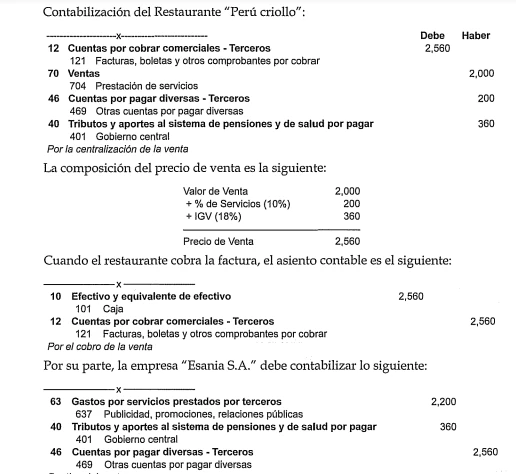 La empresa "Esania S.A." decide llevar a una delegación de posibles clientes al restaurante "Perú criollo" a degustar de la exquisita comida que preparan. El consumo total es de S/. 2,560