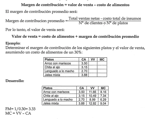 Margen de contribución = valor de venta - costo de alimentos