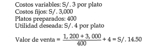 La deficiencia de este método consiste en que, cuando la producción (preparación)disminuye, el valor de venta aumenta considerablemente. Por ejemplo, supongamos que preparamos 400 platos. El valor de venta quedará de la siguiente forma: