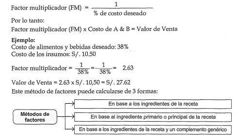El método consiste en determinar un factor multiplicador (FM) para ser aplicado a los costos de consumo. Está basado en el porcentaje de costos de alimentos y bebidas que se desea.