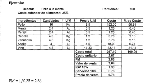 >- Se calcula el costo de los ingredientes que conforman la receta y se multiplica por el FM.