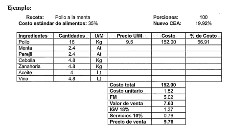 En este caso solo se ha considerado el costo del pollo, porque es el ingrediente principal de la receta. Este ingrediente equivale al 56.91 %, por lo tanto generará un nuevo costo estándar de alimentos (CEA).